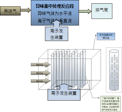 交叉流集中處理裝置:設備采用360度無死角圓形射流管輸送離子流氣體,射流風速在3-4m/s,嚴格控制離子與異味污染物反應氧化時間在>2秒,控制流速1-2m/s,設計異味氣體與離子氣體交叉形式接觸,大大提高離子與異味污染物分子碰撞幾率,使保證異味處理及凈化的效率>90%以上。