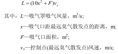 臭氣收集與控制的局部收集罩應符合下列規定:吸氣罩口應該盡量靠近臭氣集中散發的地方,能采用密閉罩的地方優先采用密閉罩,采用外部集氣罩情況下,在不影響其他設備和工作人員操作情況下盡可能靠近臭氣散發源。吸氣氣流方向應盡可能與臭氣散發源自然散發方向一致。采用局部吸氣罩時,應在罩口四周位置設置圍擋或采取防止其他氣流干擾的措施。局部吸氣罩距離臭氣散發源最遠點距離不大于1.5倍吸氣口直徑,吸氣罩吸氣風量按照下述公式計算:
