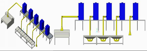 由于生產現場工作臺操作要求兩邊有人同時操作,而且玻璃纖維粉塵密度比較大,自然條件下是向下飄落,工作臺中間部分由于有玻璃纖維制品模板擋著,也不能中間收集,所以綜合考慮設計定制了工作臺兩邊斜側吸收集粉塵的方法,采用工作和收塵一體的工作臺方案。