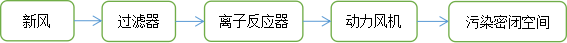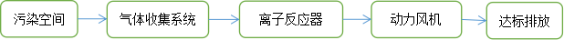 將污染嚴重的空間密閉,通過臭氣收集系統把室內污染氣體排放到離子除臭系統,過濾后的新風經過離子反應器產生大量的離子風,再經過特殊設計的離子風注入系統,把離子風注入到臭氣反應腔內,離子風和排放的臭氣污染物充分混合、反應,最后通過動力風機和煙囪達標排放出去。