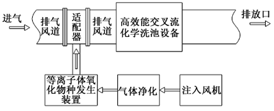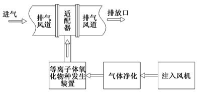 對于異味濃度較低的場合,例如卷包除塵異味以及制絲環境異味氣體的處理,只需要使用單獨的注入等離子法異味處理系統就可以滿足要求了,工藝框圖如圖 1 所示。